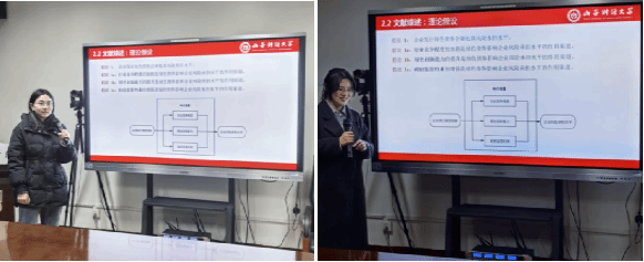 随后,两位老师对此次汇报进行了点评与总结。两位老师都对本期学术汇报予以肯定。其中,孙长青老师强调论文研究应注重理解本质因果联系而非简单套用模型。他指出,绿色债券发行之所以可能降低企业风险承担水平,原因在于资金监管约束增强以及投资选择增多。他建议研究者掌握统计分析方法来发现数据规律,并通过假设验证来验证研究方向的正确性。此外,李建莹老师对论文质量予以肯定,并指出论文研究与写作需把握核心要点:筑牢理论分析根基,打磨引言、假设推导等部分,明晰政策背景与现实问题的逻辑关联,聚焦经济逻辑而非单纯关注实证结果;重视高质量论文精读,达到能够自然复述并准确把握其逻辑的程度,关注首篇精读文章质量并了解作者背景,其会影响后续研究方向;准确规范运用实证方法,明确PSM、DID的核心作用,二者结合时确保模型设定正确;把控研究设计细节,注意指标正负向区分、保证变量测度明确,规避原文在中介机制、指标判断、方法应用及数据测量中的问题;全程严守学术规范,做好格式、错别字等细节检查。